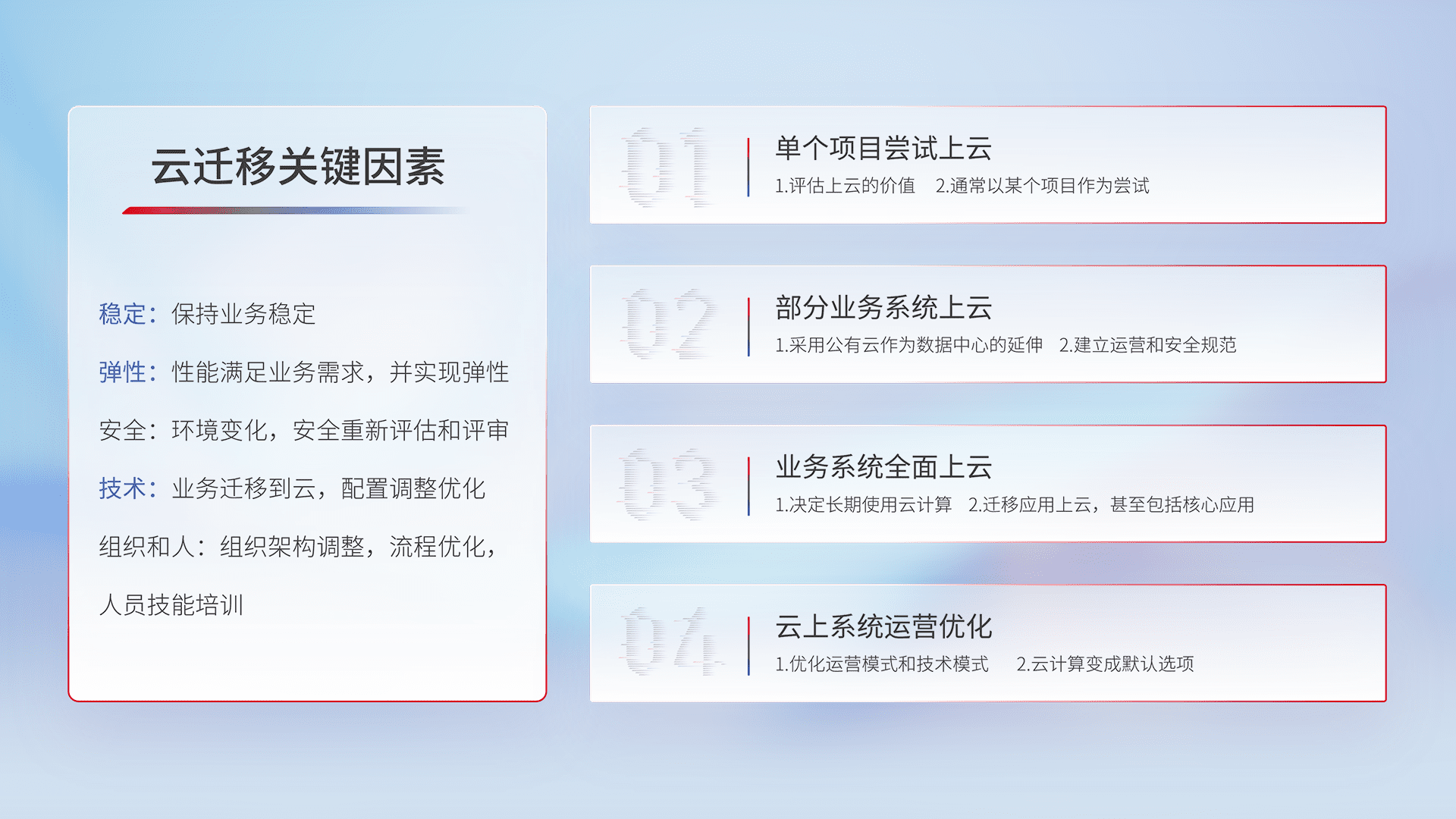 结合实际业务,,从规划设计、、、云平台选型、、云原生改造、、、、数据迁移、、、、集成交付,,,迁移全过程为客户识别最佳上云路径,,,做好风险识别管理,,,,设计网络架构、、、身份权限、、安全审计合规、、操作审计、、、日志审计、、、监控告警策略、、、、多站点容灾设计等,,,对云上基础设施进行整体规划,,提升IT治理水平,,以满足弹性、、高可用、、高性能的需求。。