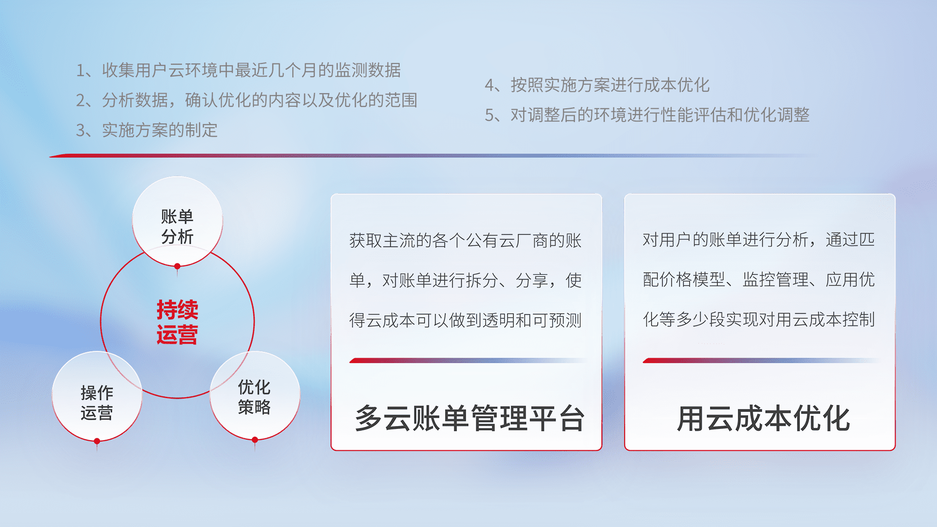 通过多云纳管,,以统一的资源数据模型把客户的云资源进行抽象和封装,,,进而实现对多云资源的统一操作,,,保障云资源管理的可靠性、、、、稳定性与可用性。。量身定制化运维内容,,,,配置、、开发运维、、补丁管理、、、、备份、、、、监控、、认证和访问管理、、、审计和日常巡检等,,保障在用云过程中的可靠度,,,稳定度以及高可用率。。。