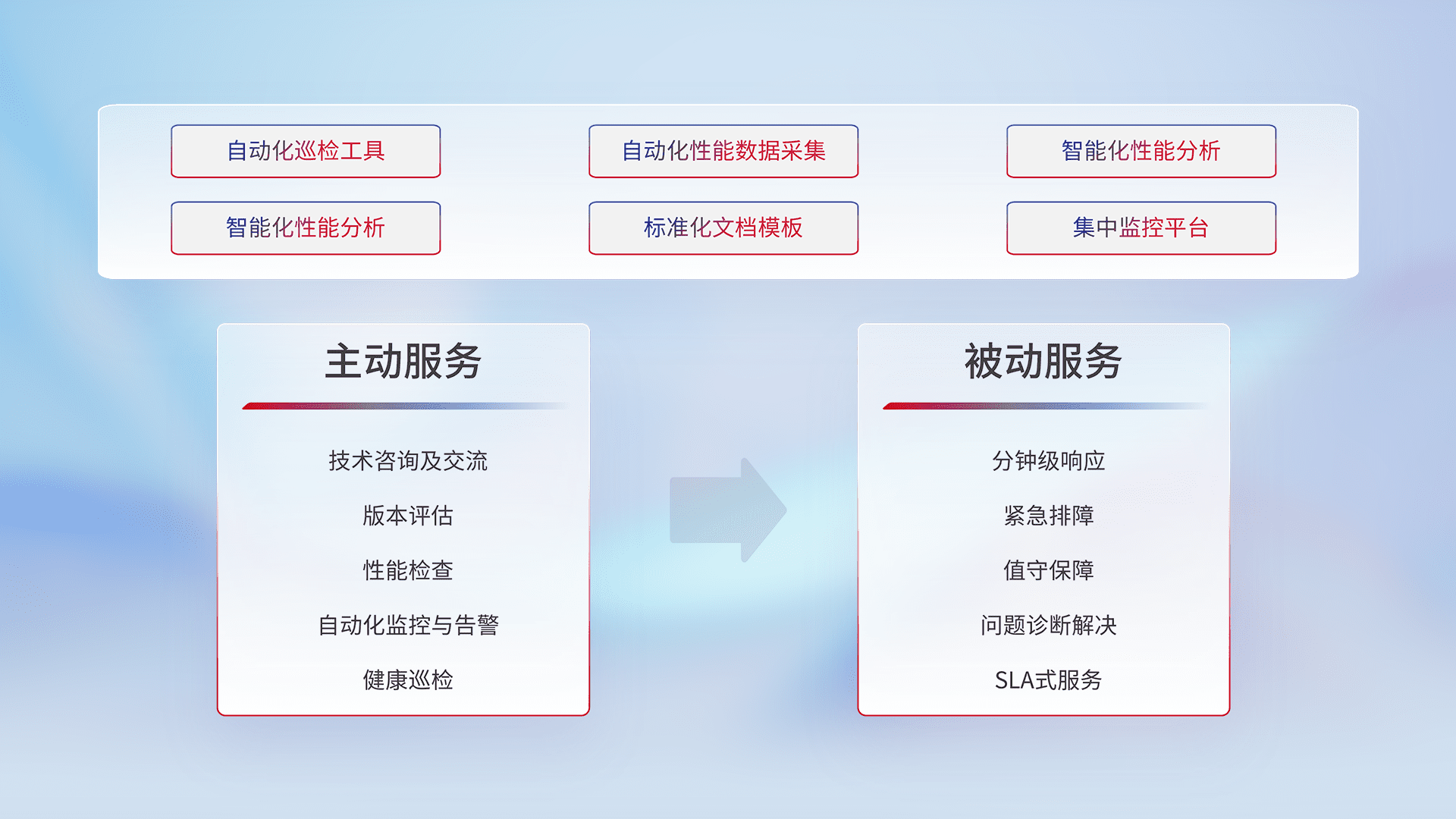 智能化工具和标准化文档,,保障服务质量,,,提供主动服务(包含技术咨询、、、版本评估、、、性能检查、、、自动化监控与告警、、、、健康巡检)和被动服务包含(分钟级响应、、紧急排障、、、、值守保障、、、、问题诊断解决、、、SLA服务)。。